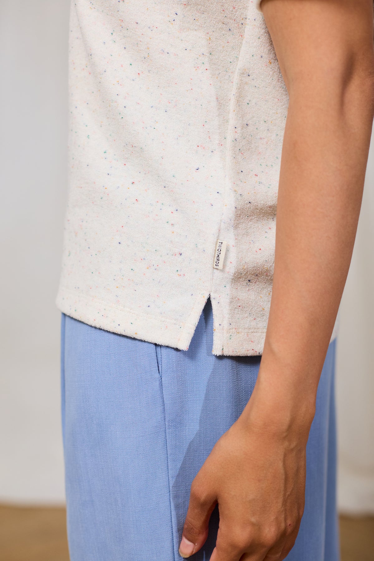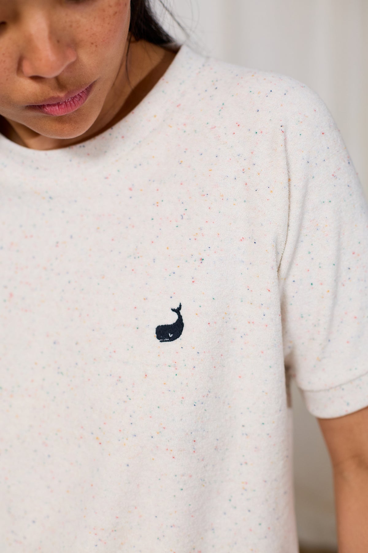 • Details: Stickerei auf der Brust | mehrfarbige Neps | Frotteestoff | kurze, seitliche Schlitze