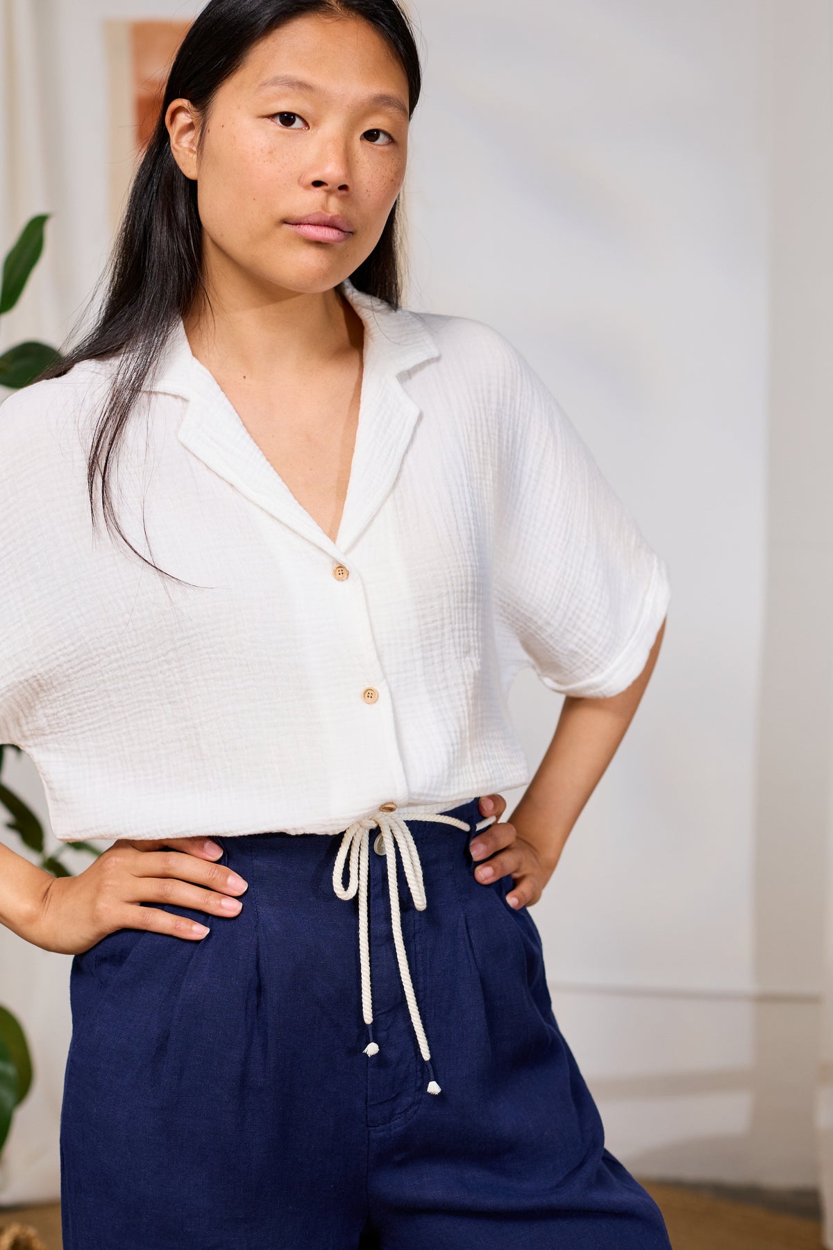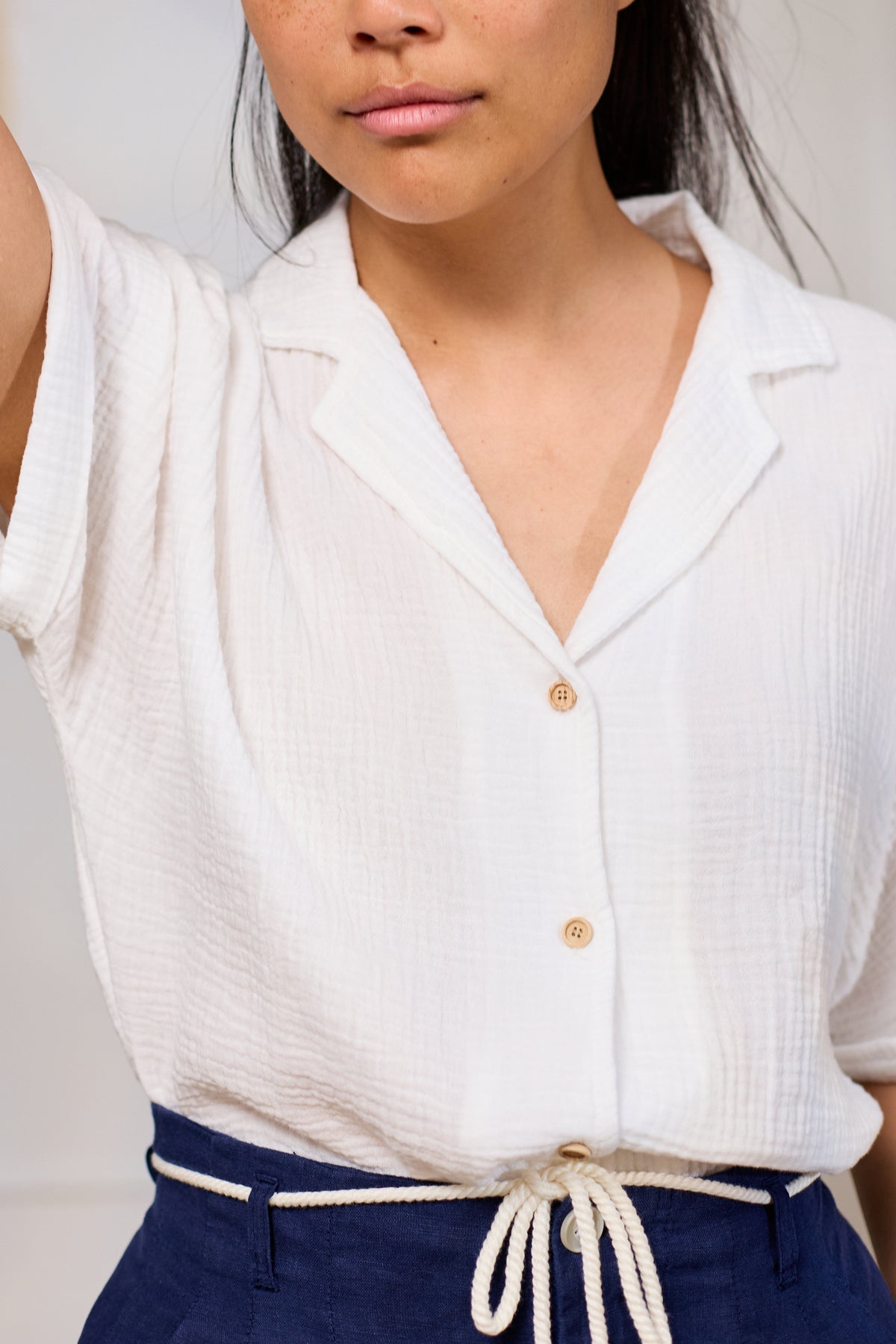 • Details: Strukturierter Webstoff | gekrempelter Ärmelsaum | Knöpfe aus Naturholz